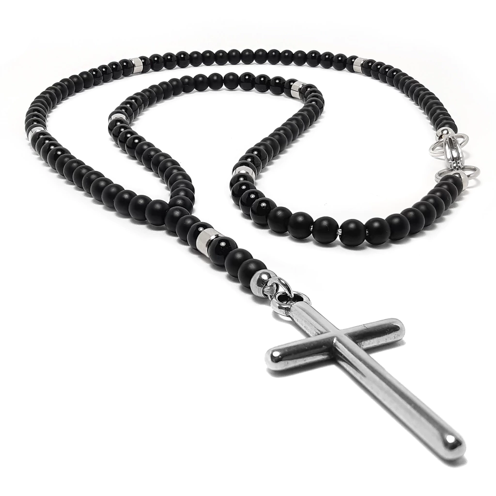 El Collar Élite de NEO MEN combina piedras naturales de ónix mate y brillante (4 mm) con bolas de acero, esferas, cruz y cierres en acero quirúrgico, logrando una pieza sólida, elegante y resistente.