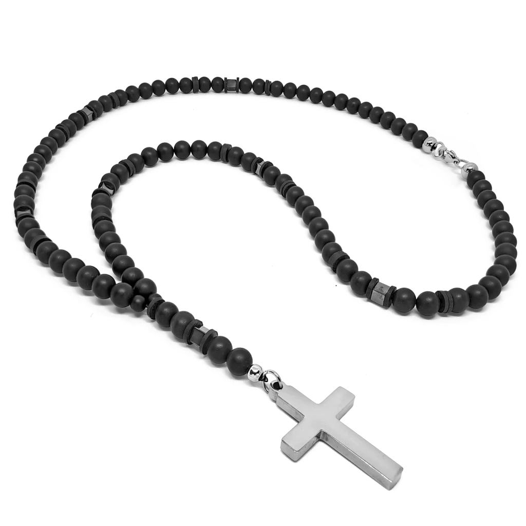Collar Krome para hombre de NEO MEN. Collar de ónix y hematite con cruz en acero quirúrgico, donas de silicona y cierres clásico o marinero. Disponible en talles 60 y 70 cm, resistente al agua.