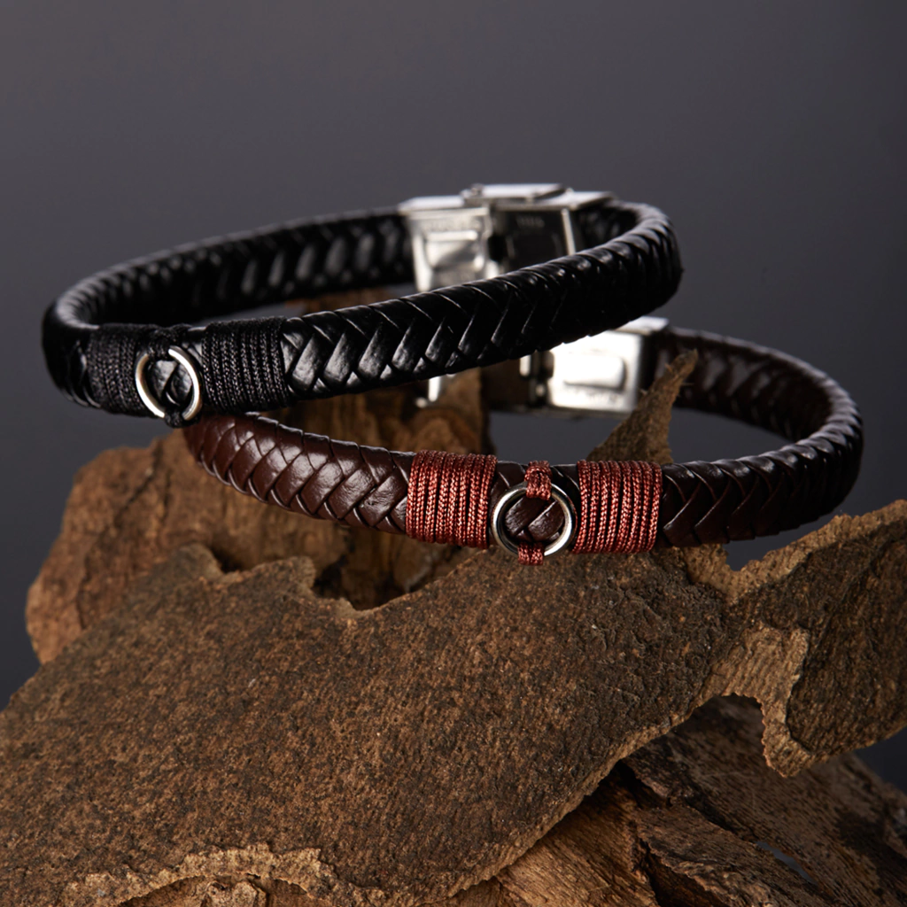 Fabricada con cuero sintético premium, acero quirúrgico y detalle metálico central. Su combinación de materiales ofrece durabilidad, estilo y una apariencia refinada sin uso de materiales de origen animal.