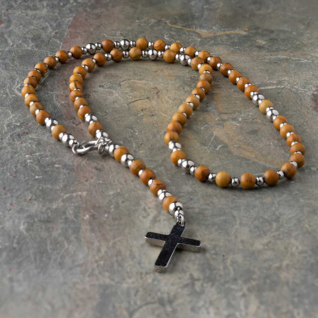 Hecho con piedras naturales de jaspe madera (6 mm) y bolas de acero quirúrgico (4 mm), unidos con hilo y detalles metálicos que aportan resistencia, equilibrio visual y durabilidad.